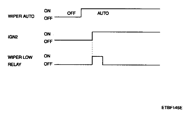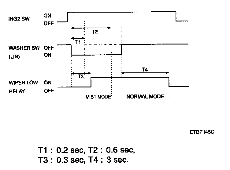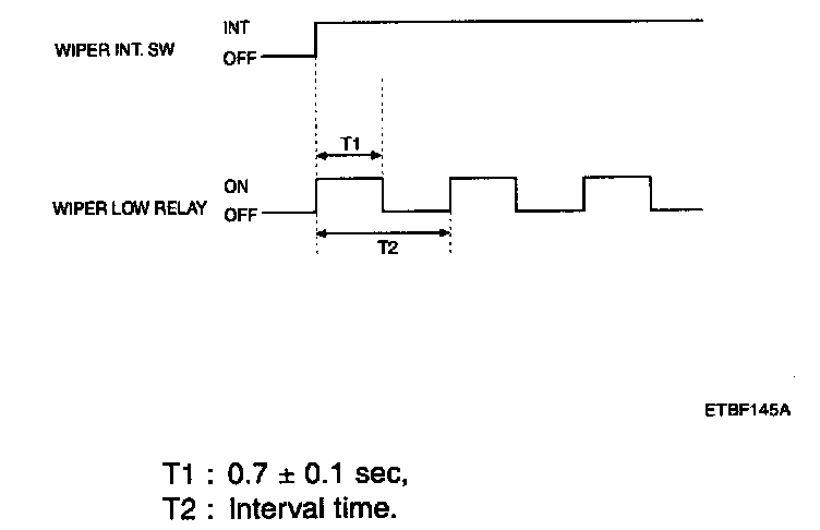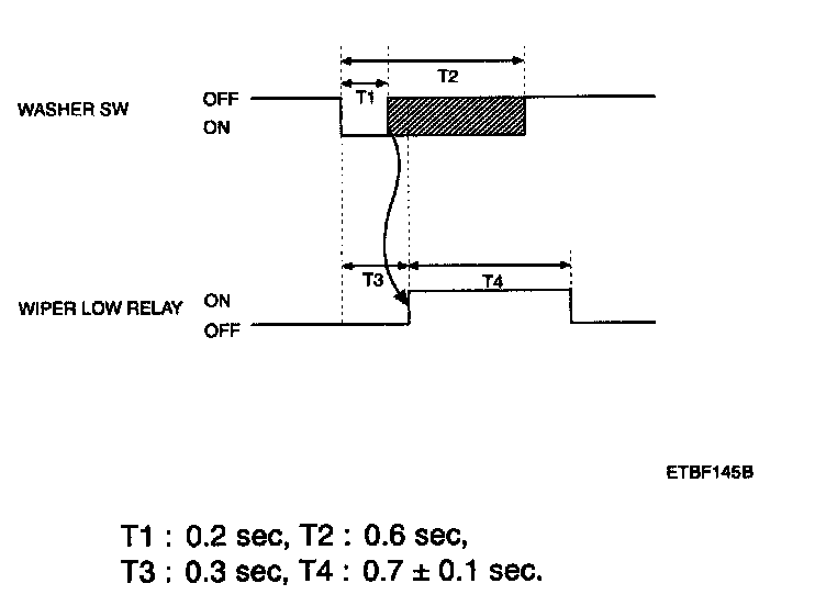 1. If the duration of washer switch input is measured from 0.2 sec to 0.6 sec, after T3, the wiper low relay output is ON for 0.7 sec. (For 1 Time wiping)