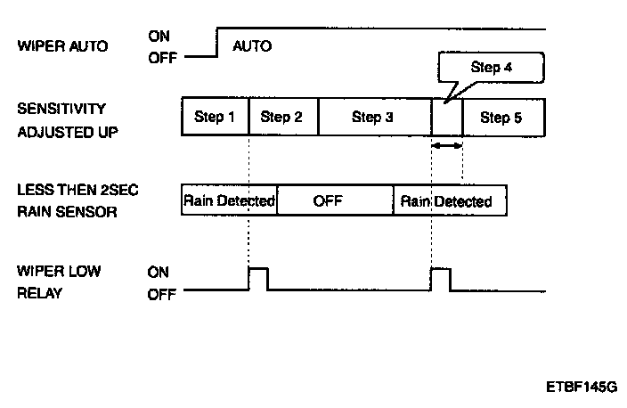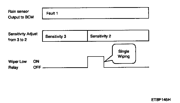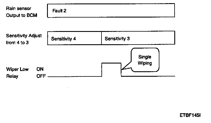 4. The drive may adjust the rain sensor performance by adjusting the sensitivity input. When in automatic mode, the BCM will perform a single wipe each time the sensitivity is adjusted upward to a more sensitive setting (downward more then one step). This single wipe will only be performed if Rain Detected signal is being received from the Rain sensor. If the sensitivity adjustment is adjusted upward more than one sensitivity, the BCM will only perform a single wipe unless the time between Increases is more than 2 seconds.