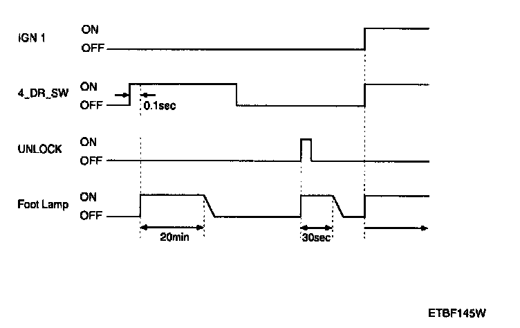 1. When foot lamp off & IGN1 off & all door closed, if transition of all doors closed to not (all doors closed) for more than 0.1 sec, foot lamp is turned on for 20 min.