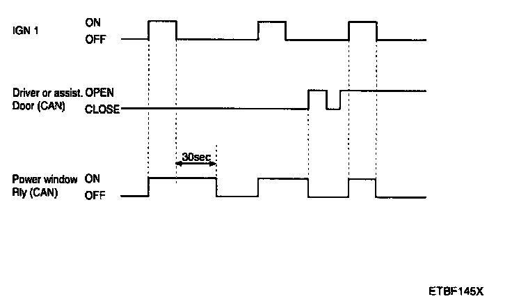 2. When IGN1 switch is turned off, the power window relay CAN signal remains on for 30 sec and then is turned OFF