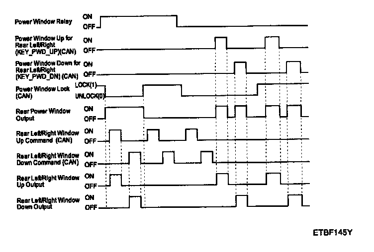 Power window relay OFF or Power window LOCK CAN signal LOCK and rear power window UP/DOWN CAN signal OFF.