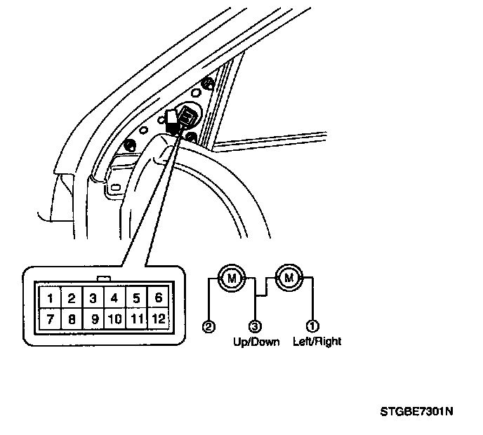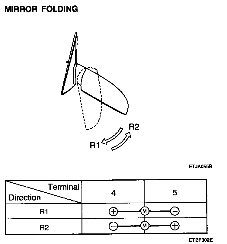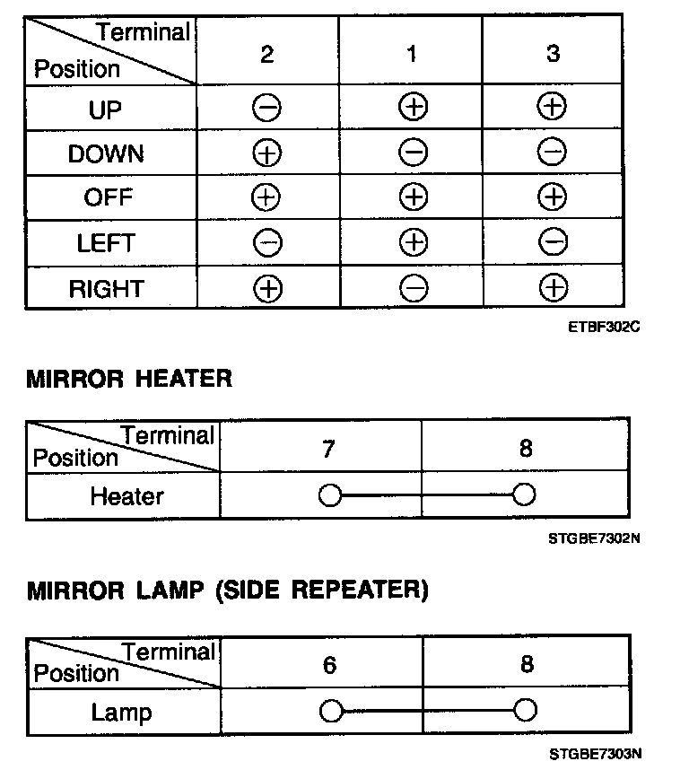 3. Apply battery voltage to each terminal as shown in the table and verify that the mirror operates properly.