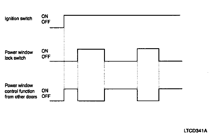 When the driver's power window lock switch is ON, each safety window ECU receives the power window lock command to prohibit the operation by the passenger side doors except the driver's door.