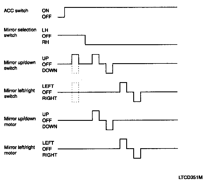 If the mirror direction switch (up, down, left and right) is pressed when mirror selection switch on driver side power window switch is in outside LH under ACC ON condition, then mirror motor moves to the corresponding direction.