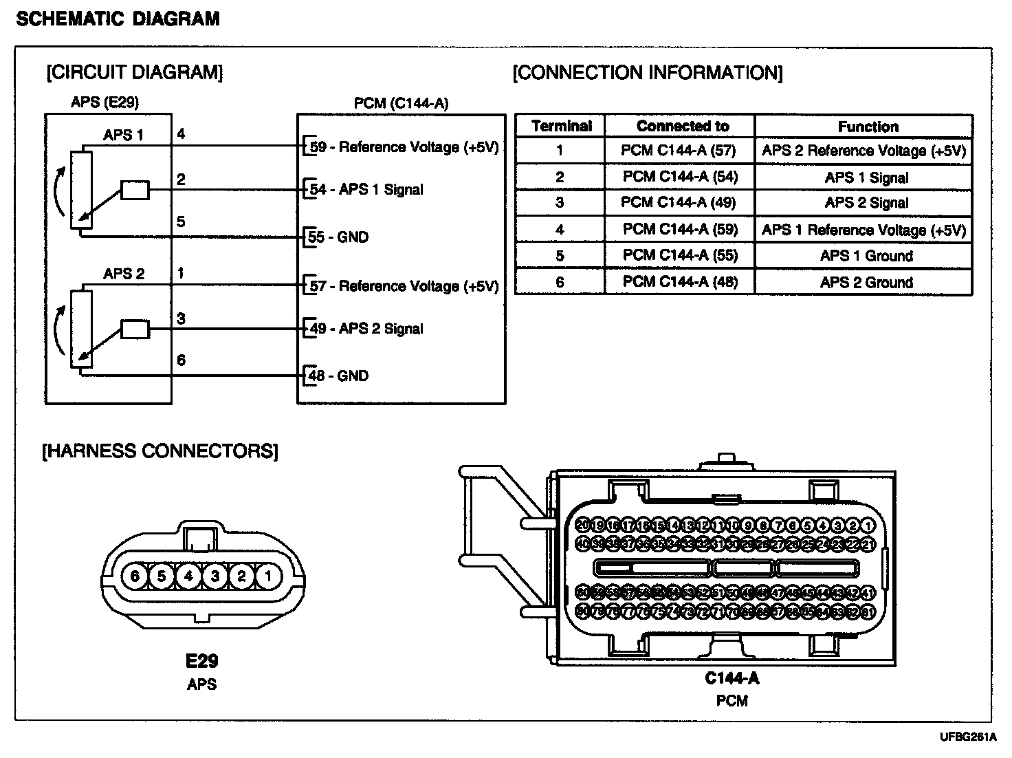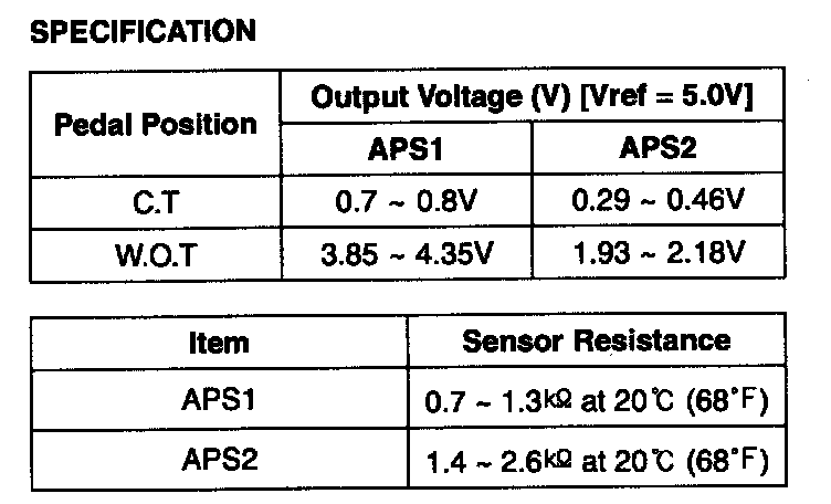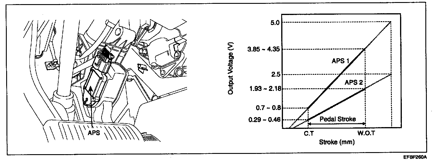 Accelerator Position Sensor (APS) is installed on the accelerator pedal module and detects the rotation angle of the accelerator pedal. The APS is one of the most important sensors in engine control system, so it consists of the two sensors which adapt individual sensor power and ground line. The second sensor monitors the first sensor and its output voltage is half of the first one. If the ratio of the sensor 1 and 2 is out of the range (approximately 1/2), the diagnostic system judges that it is abnormal.