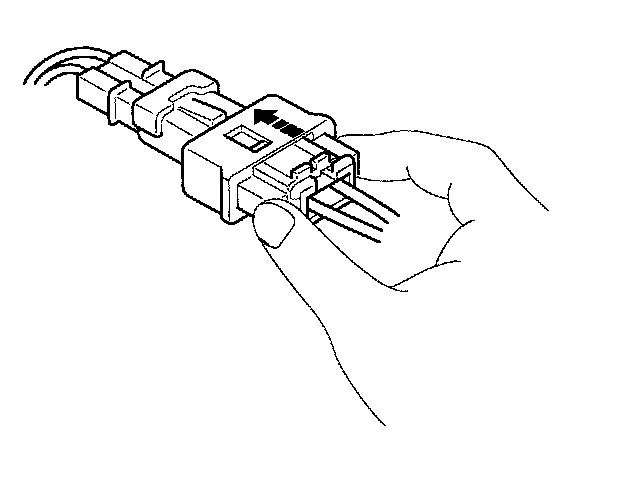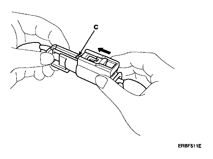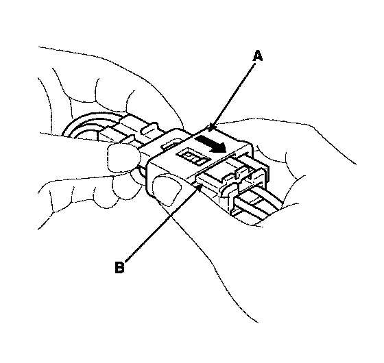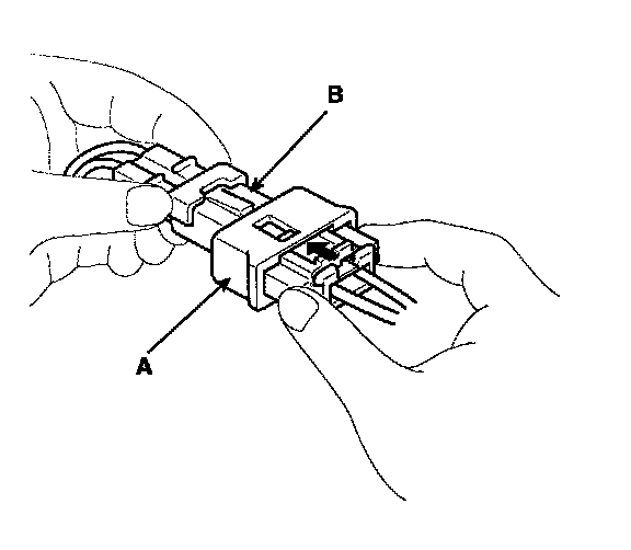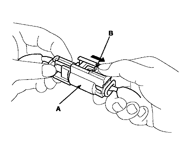 1. To reconnect, hold the pawl-side connector half, and press on the back of the sleeve-side connector halt in the direction shown. As the two connector halves are pressed together, the sleeve (A) is pushed back by the pawl (C). Do not touch the sleeve.