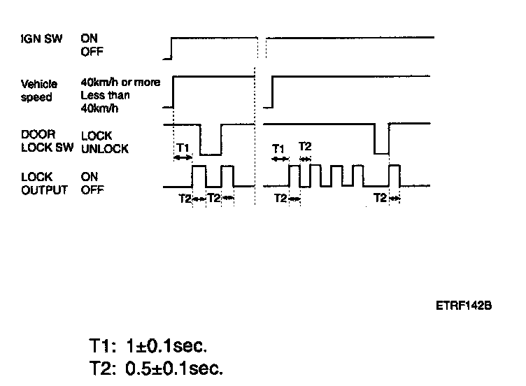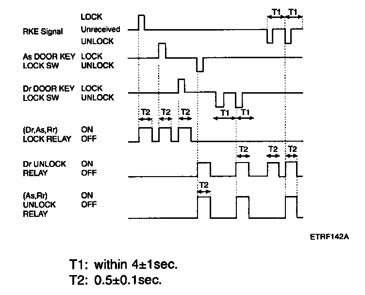 2. Driver door unlock signal is output for T2 when RKE UNLOCK signal is received. But, all door unlock signals are output for T2 if RKE UNLOCK signal is received within T1.