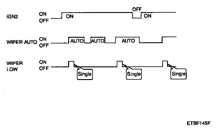 3. A single wipe will be performed whenever rain has been detected (Rain Detected signal from Rain sensor) and the wiper switch is moved to the AUTO position. But a single wipe will not be performed when the wiper switch is moved to the AUTO position and OFF signal is being received from Rain sensor. But if the wiper switch is moved to AUTO position for the first time since vehicle ignition switch is turned on then a single wipe will be performed regardless of Rain Detected or OFF signal.