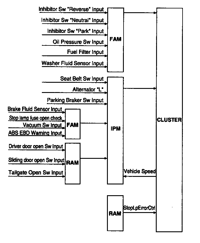 The IPM receives on digital input the status of the parking brake switch and by CAN network the status of the vacuum switch, the status of the ABS EBD warning, the status of the brake fluid sensor and the speed of the vehicle.
