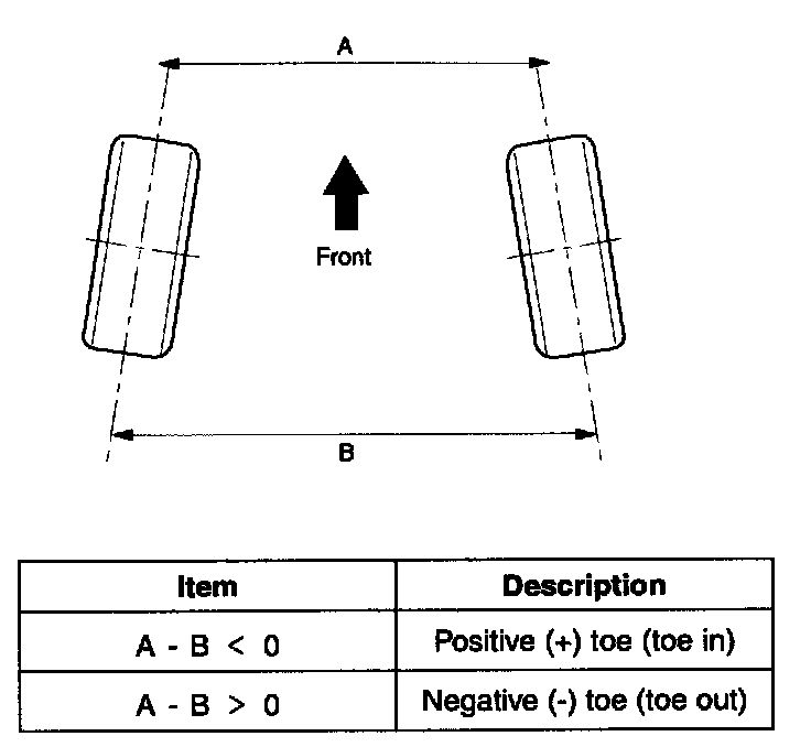 When the wheels are turned in toward the front of the vehicle, toe is positive (+) (toe in). When the wheels are turned out toward the front of the vehicle, toe is negative(-) (toe out). Toe is measured in degrees, from side to side, and totaled.