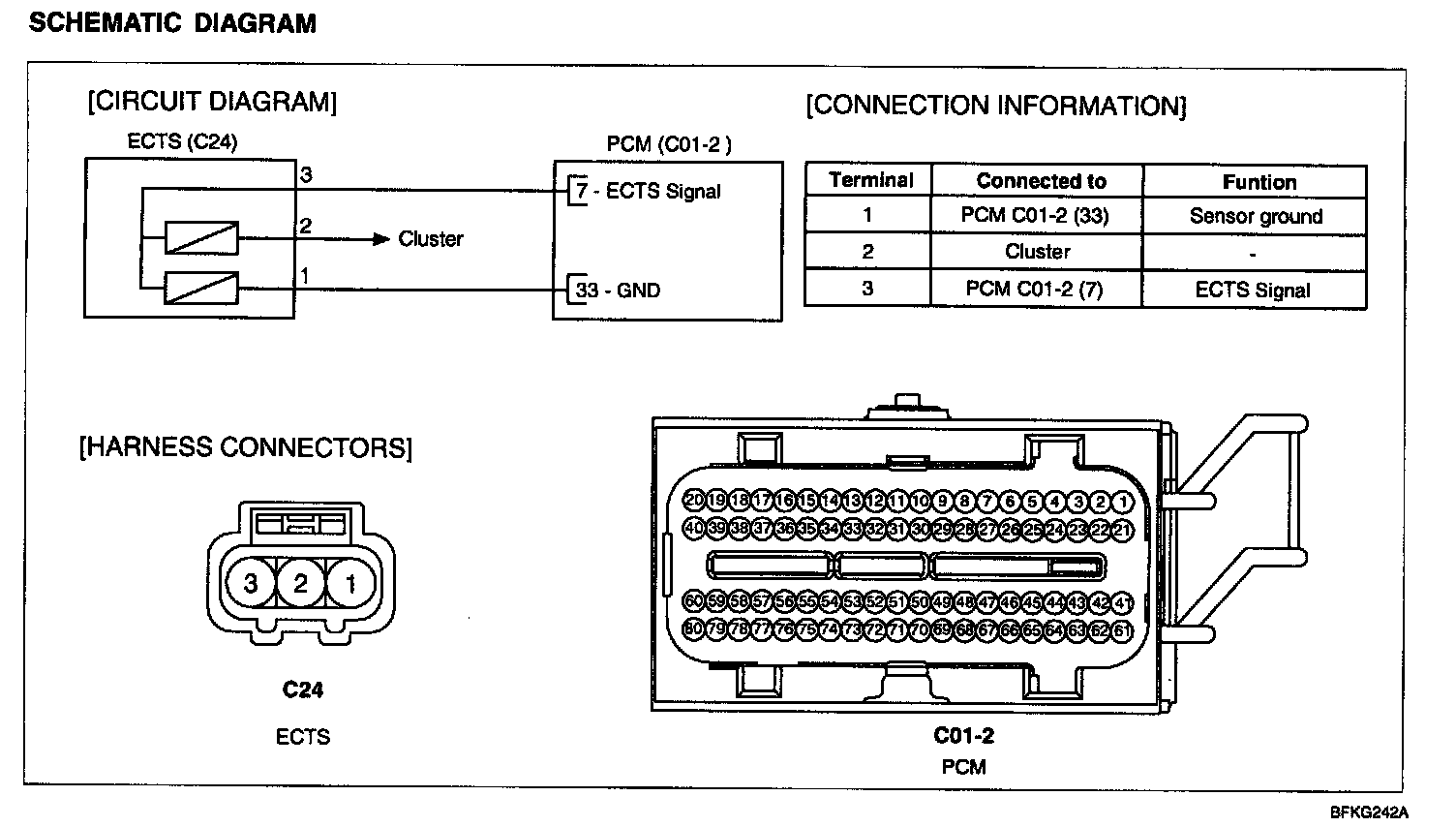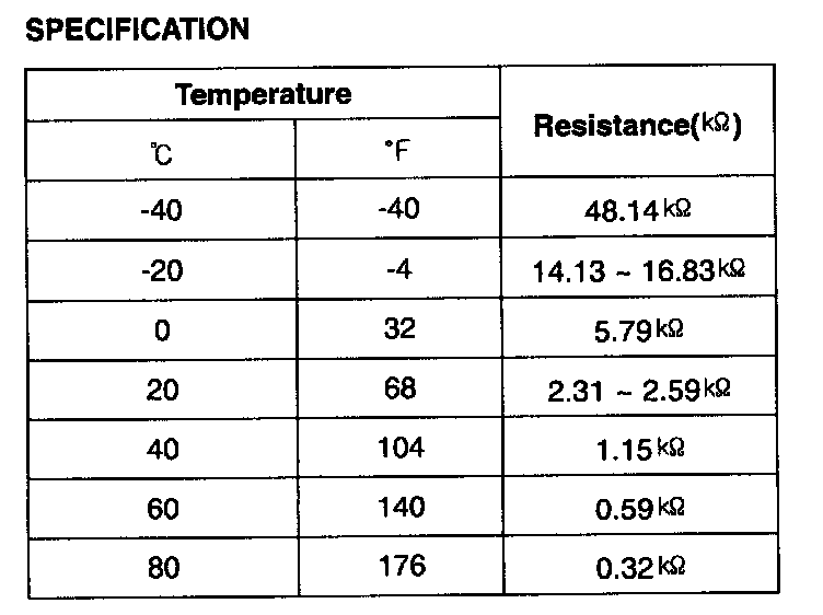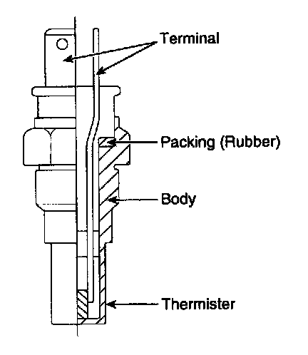 Engine Coolant Temperature Sensor (ECTS) is located in the engine coolant passage of the cylinder head for detecting the engine coolant temperature. The ECTS uses a thermistor whose resistance changes with the temperature. The electrical resistance of the ECTS decreases as the temperature increases, and increases as the temperature decreases. The reference 5 V in the PCM is supplied to the ECTS via a resistor in the PCM. That is, the resistor in the PCM and the thermistor in the ECTS are connected in series. When the resistance value of the thermistor in the ECTS changes according to the engine coolant temperature, the output voltage also changes. During cold engine operation the PCM increases the fuel injection duration and controls the ignition timing using the information of engine coolant temperature to avoid engine stalling and improve drivability.