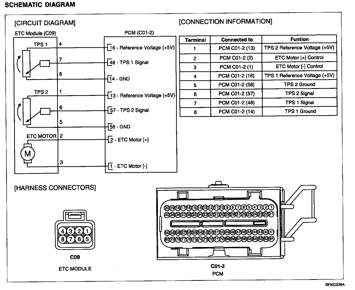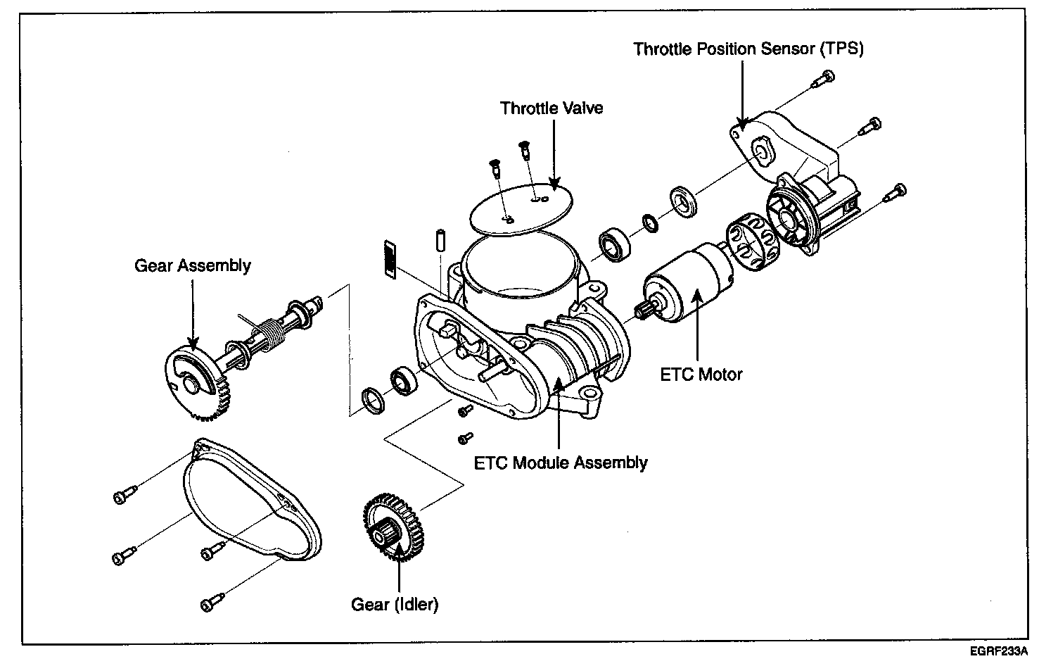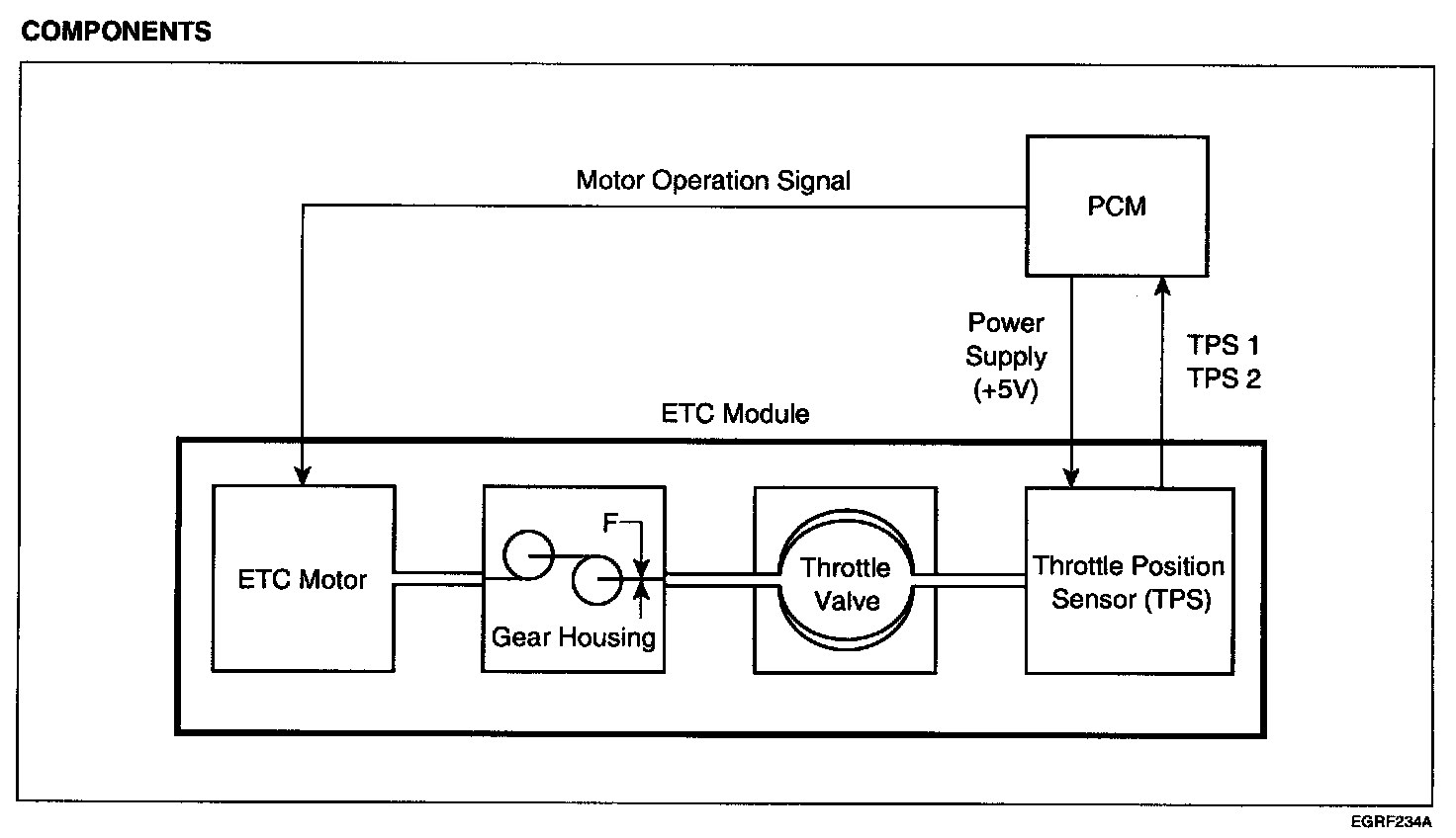 ETC (Electronic Throttle Control) system is electronically controlled throttle device which controls the throttle valve. It consists of ETC motor, throttle body and throttle position sensor (TPS). A mechanical throttle control system receives a driver's intention via a wire cable between the accelerator and the throttle valve, while this ETC system uses the signal from the Accelerator Position Sensor (APS) installed on the accelerator pedal. After the PCM receives the APS signal and calculates the throttle opening angle, it activates the throttle valve by using the ETC motor. Additionally, it can handle cruise control function without any special devices.