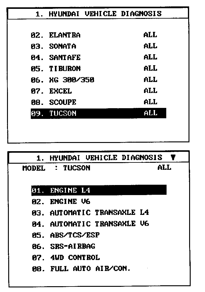1. Select "Vehicle" and "Engine" (For example, TUCSON 2.0L L4).