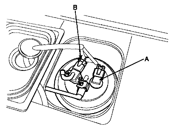 2. Disconnect the fuel pump connector (A) and the fuel tank pressure sensor connector (B).