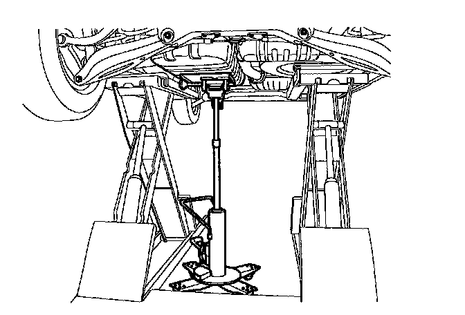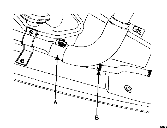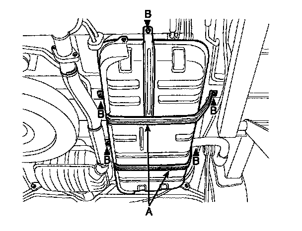 6. Remove the fuel tank band (A) by unscrewing the mounting bolts (B) and remove the fuel tank from the vehicle.