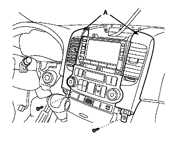 2. Remove the center facia panel, console lower cover and center air vent (A) after loosening screws. Take care not to damage fixing clips.