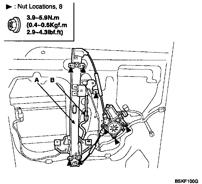 3. After loose the dooring module mounting nuts, remove the window regulator (A).