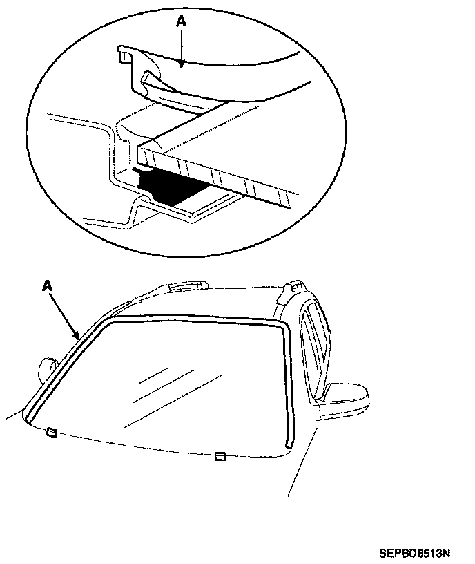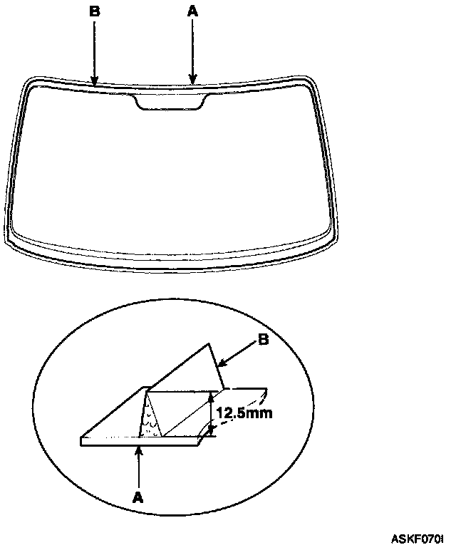 8. Pack adhesive into the cartridge without air pockets to ensure continuous delivery. Put the cartridge in a caulking gun, and run a bead of adhesive (A) around the edge of the windshield (B) between the fastener and molding as shown. Apply the adhesive within 30 minutes after applying the glass primer. Make a slightly thicker bead at each corner.