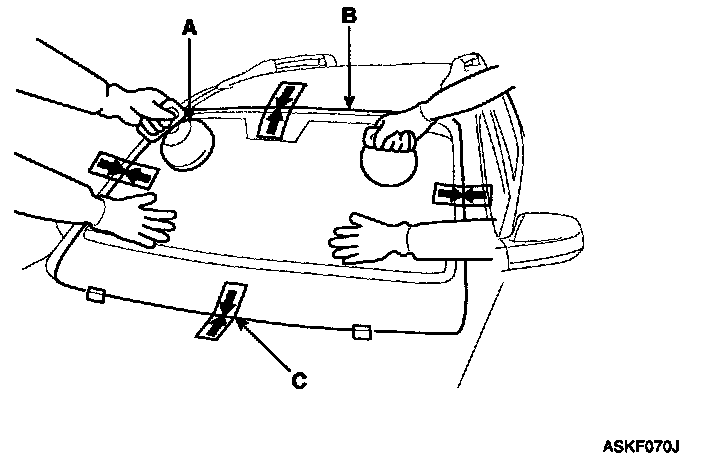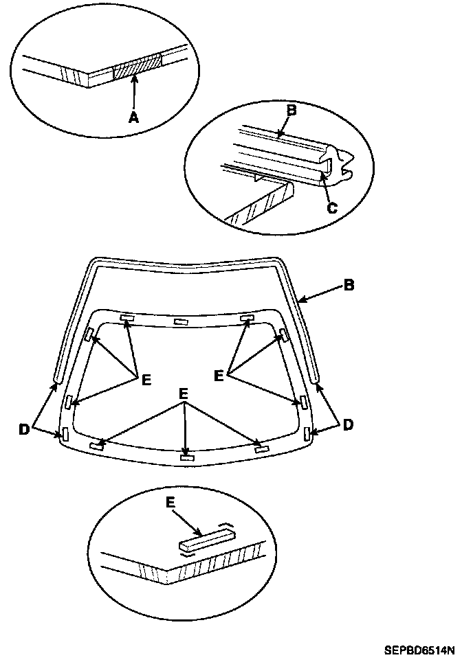 3. Install the windshield (A) upper molding (B) and fasteners (C). Do not allow any gaps.