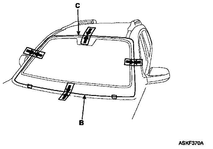 4. Install the spacer (A) install the windshield glass (B) temporarily with making sure to position them on the center, and then place the alignment mark (C).