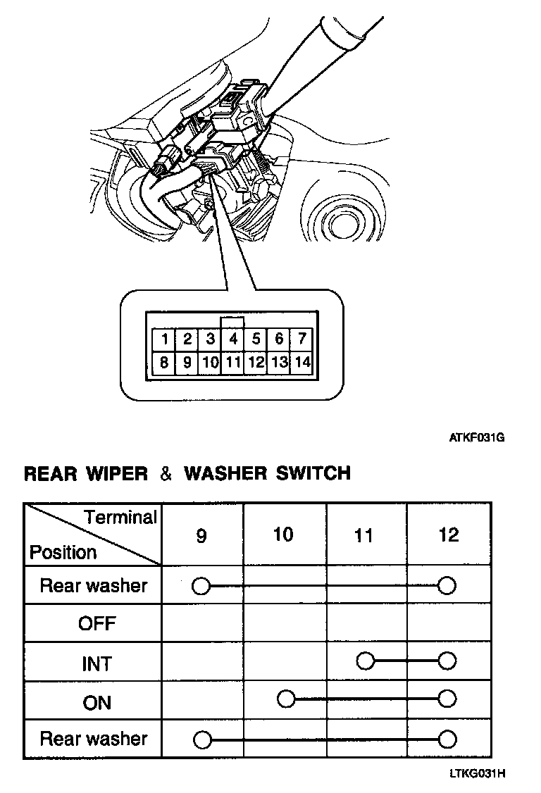 REAR WASHER SWITCHINSPECTIONWith the rear wiper & washer switch in each position, make sure that continuity exists between the terminals below. If continuity is not as specified, replace the multifunction switch.