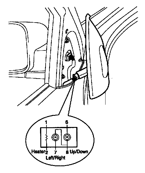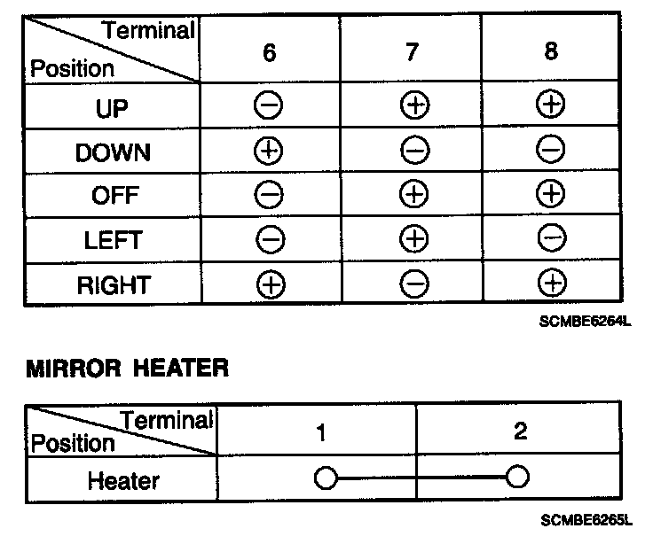 3. Apply battery voltage to each terminal as shown in the table and verify that the mirror operates properly.