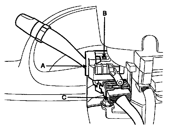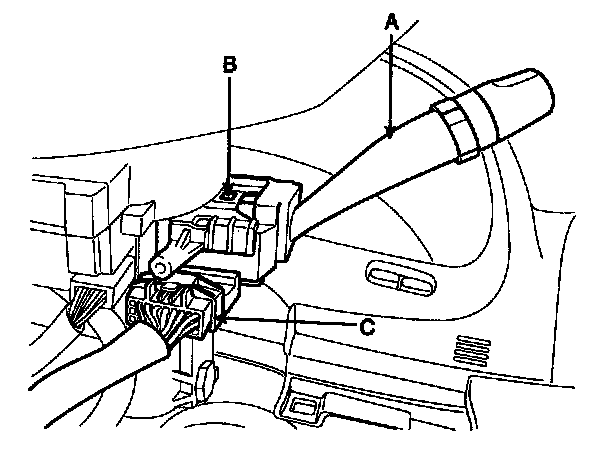 4. Remove the wiper switch (A) by pushing the lock pin (B) after disconnecting the connector (C).