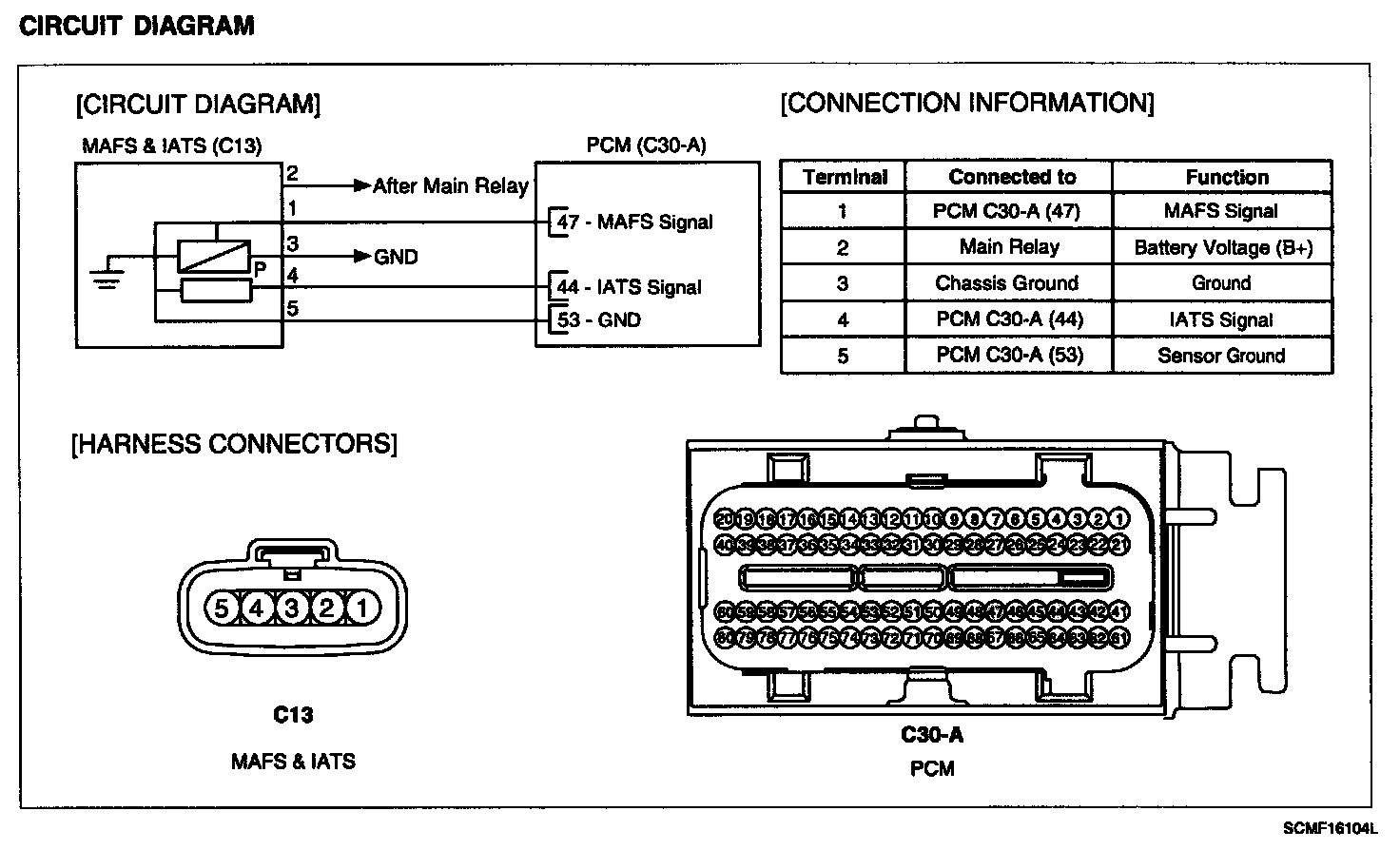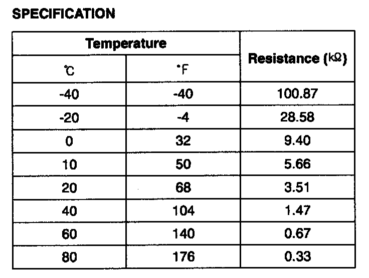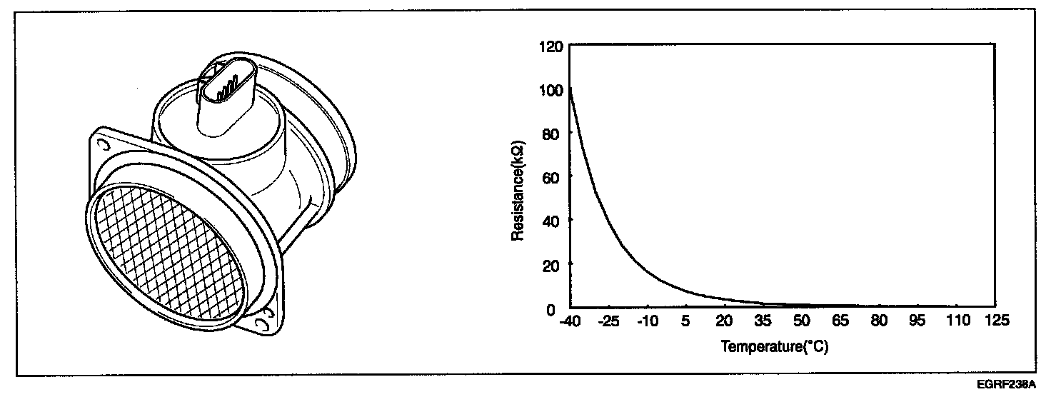 Intake Air Temperature Sensor (IATS) is installed inside the Mass Air Flow Sensor (MAFS) and detects the intake air temperature. To calculate precise air quantity, correction of the air temperature is needed because air density varies according to the temperature. So the PCM uses not only MAFS signal but also IATS signal. This sensor has a Negative Temperature Coefficient (NTC) and its resistance is in inverse proportion to the temperature.
