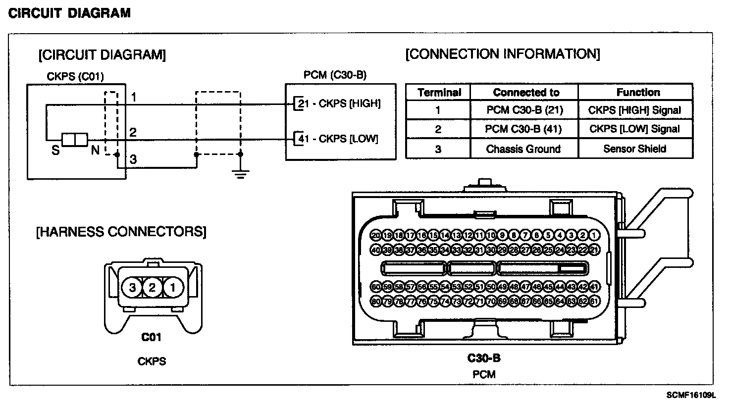 Crankshaft Position Sensor (CKPS) detects the crankshaft position and is one of the most important sensors of the engine control system. If there is no CKPS signal input, fuel is not supplied and the main relay does not operate. That is, vehicle can't run without CKPS signal. This sensor is installed on transaxle housing and generates alternating current by magnetic flux field which is made by the sensor and the target wheel when engine runs. The target wheel consists of 58 slots and 2 missing slots on 360 CA (Crank Angle).