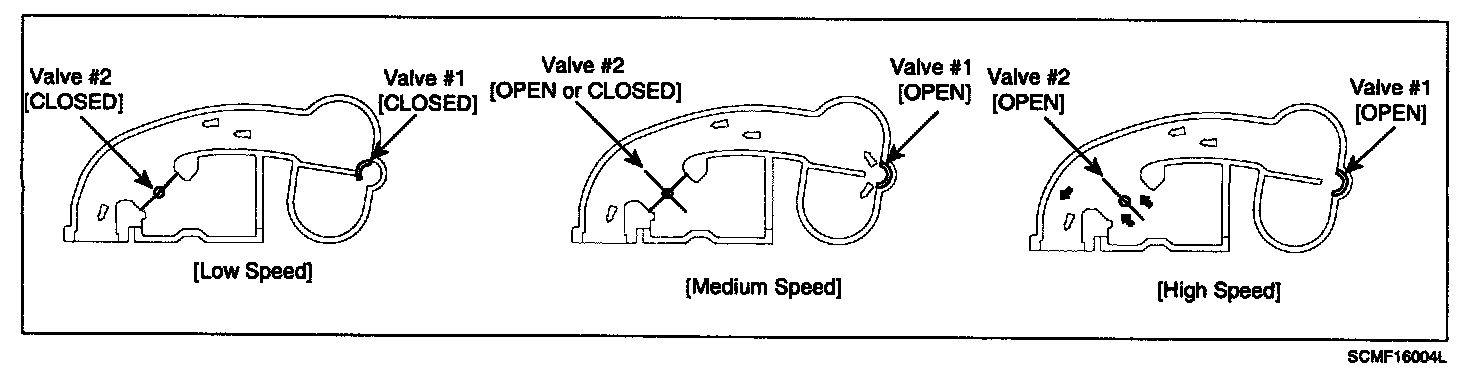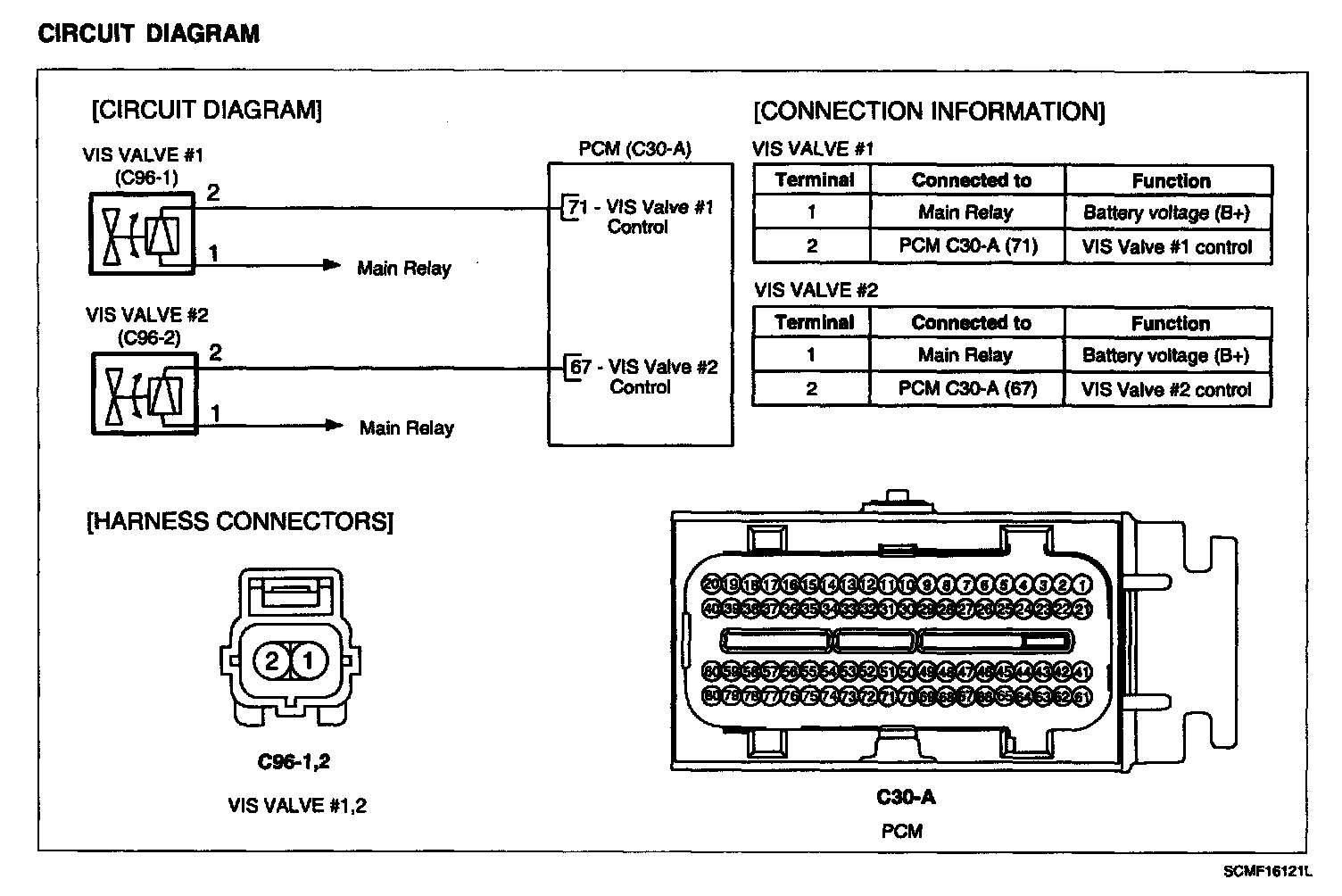 Variable Intake manifold Solenoid (VIS) valves are installed on surge tank (VIS Valve #1) and intake manifold (VIS Valve #2). These VIS valve #1 and #2 control vacuum modulators which activate valves in surge tank and intake manifold. These valves are opened or closed by PCM according to engine condition (Refer to below table).
