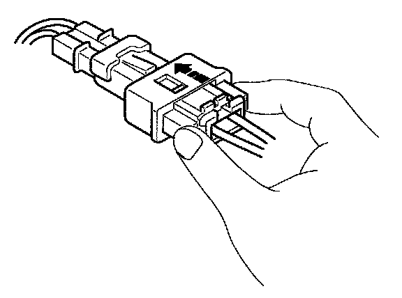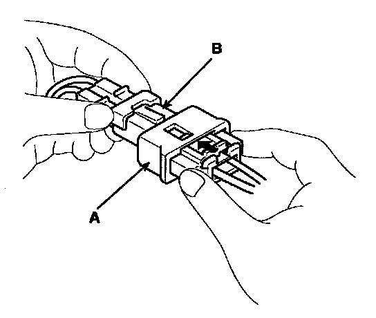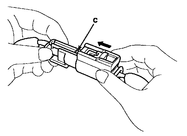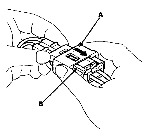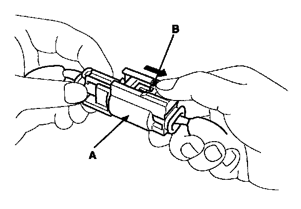 1. To reconnect, hold the pawl-side connector half, and press on the back of the sleeve-side connector half in the direction shown. As the two connector halves are pressed together, the sleeve (A) is pushed back by the pawl (C). Do not touch the sleeve.