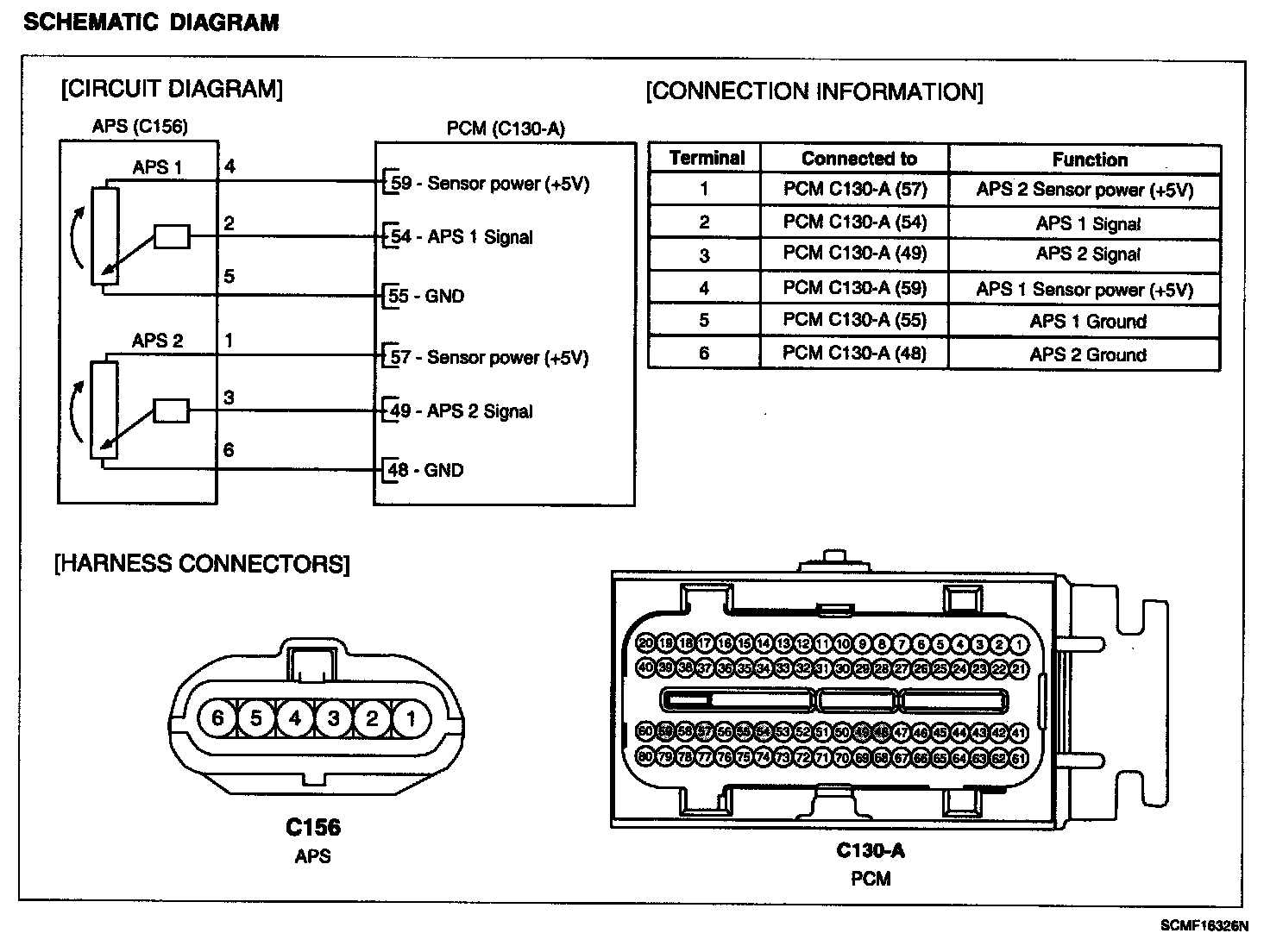 Accelerator Position Sensor (APS) is installed on the accelerator pedal module and detects the rotation angle of the accelerator pedal. The APS is one of the most important sensors in engine control system, so it consists of the two sensors which adapt individual sensor power and ground line. The second sensor monitors the first sensor and its output voltage is half of the first one. If the ratio of the sensor 1 and 2 is out of the range (approximately 1/2), the diagnostic system judges that a malfunction has occurred.