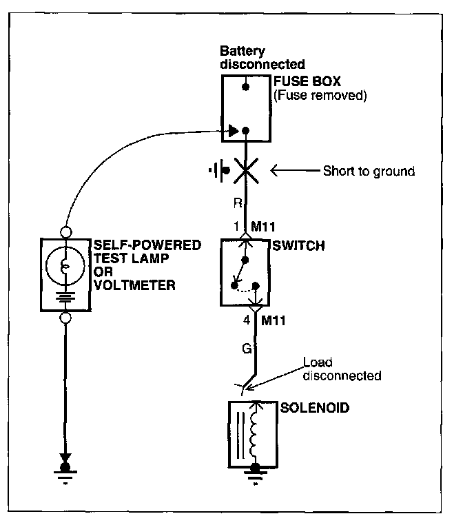 e. When the self-powered test lamp glows, or ohmmeter registers, there is a short to a ground in the wiring near that point.