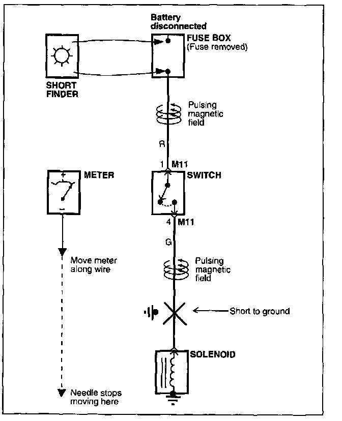 e. Beginning at the fuse box, slowly move the short finder along the circuit wiring. The meter will show current pulses through sheet metal and body trim. As long as the meter is between the fuse and the short, the needle will move with each current pulse. Once the meter is moved past the point of the short, the needle will stop moving. Check around this area to locate the cause of the short circuit.
