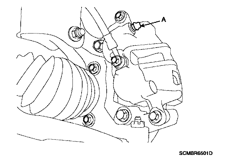 3. Loosen the right-rear brake bleed screw (A) to allow air to escape from the system. Then tighten the bleed screw securely.