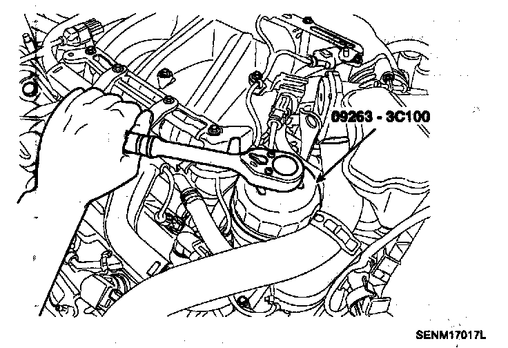 3. Wait for 5 minutes after loosening the oil filter cap by turning it counterclockwise with the SST (09263-3C100) to drain well the oil in the oil filter.