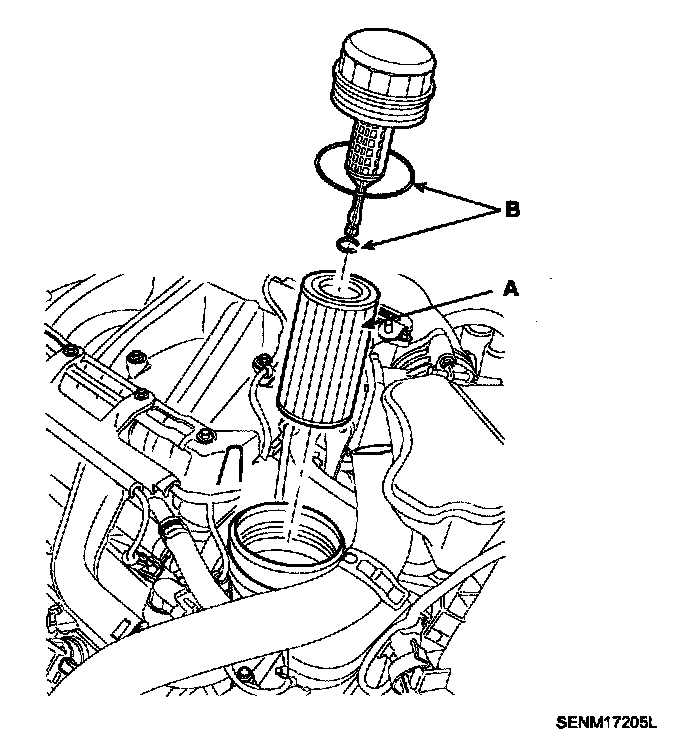 e. Install a new oil filter element (A) and two new O-rings (B).
