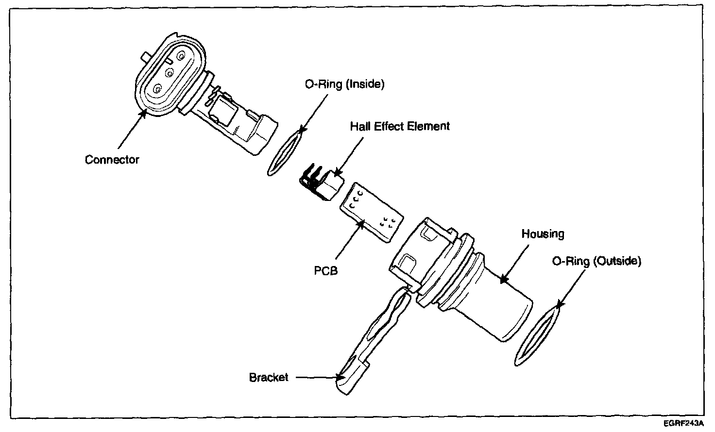 Camshaft Position Sensor (CMPS) is a hall sensor and detects the camshaft position by using a hall element. It is related with Crankshaft Position Sensor (CKPS) and detects the piston position of each cylinder which the CKPS can't detect. The two CMPS are installed on engine head cover of bank 1 and 2 and uses a target wheel installed on the camshaft. This sensor has a hall-effect IC which output voltage changes when magnetic field is made on the IC with current flow. So the sequential injection of the 6 cylinders is impossible without CMPS signal.