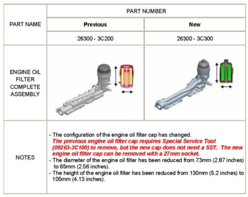 ^ When replaced as a complete assembly, the previous oil filter complete assembly (P/N 26300-3C200) is interchangeable with the new assembly (P/N 26300-3C300).