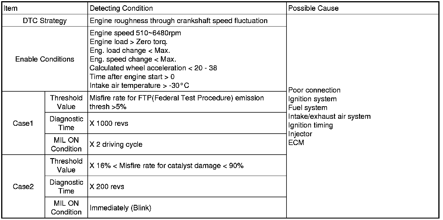 Misfires can be caused by lack of combustion in a cylinder due to absence of spark, poor fuel metering, poor compression, or many other causes. Even a small number of misfires may result in excessive exhaust emissions due to the unburned mixture. Increased misfire rates cause damage to the catalytic converter. The PCM monitors the crankshaft speed variation to determine if any misfiring generated. The PCM identifies the specific cylinder in which the misfire has occurred and counts individual misfire events by monitoring changes in the crankshaft rotation for each cylinder. A random misfire indicates two or more cylinders are misfiring.