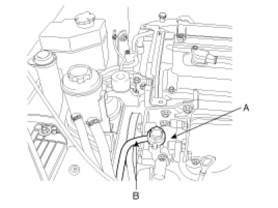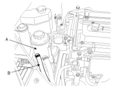 2. Disconnect the return hose (B) from the power steering fluid reservoir (A).