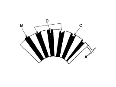 7. Check the mica depth (A). If the mica is too high (B), undercut the mica with a hacksaw blade to the proper depth. Cut away all the mica (C) between the commutator segments. The undercut should not be too shallow, too narrow, or v-shaped (D).