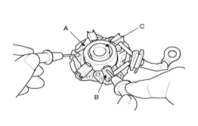 9. Check with an ohmmeter that no continuity exists between the commutator (A) and armature coil core (B), and between the commutator and armature shaft (C). If continuity exists, replace the armature.