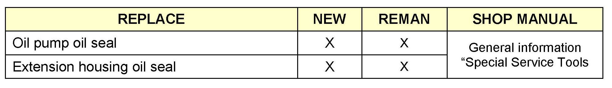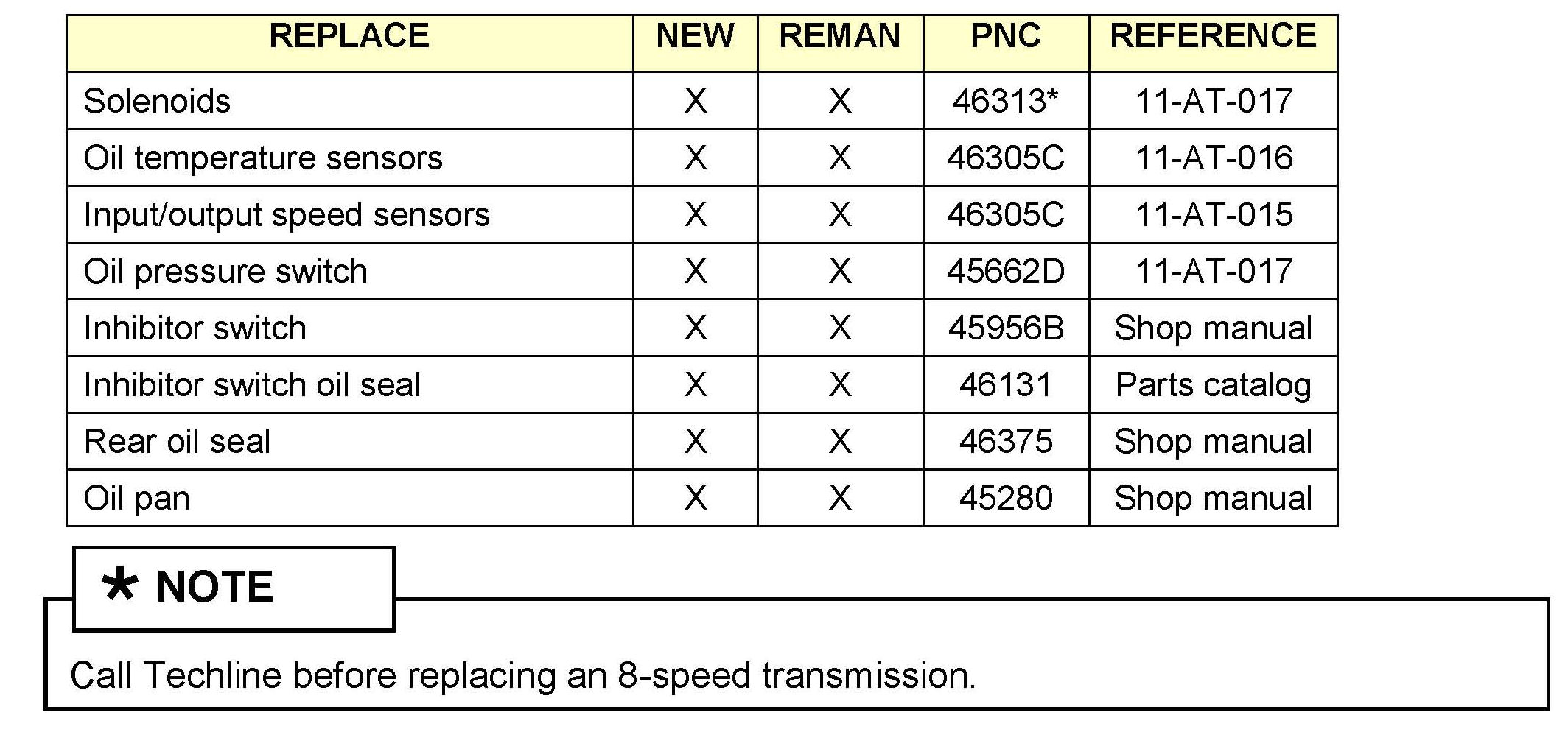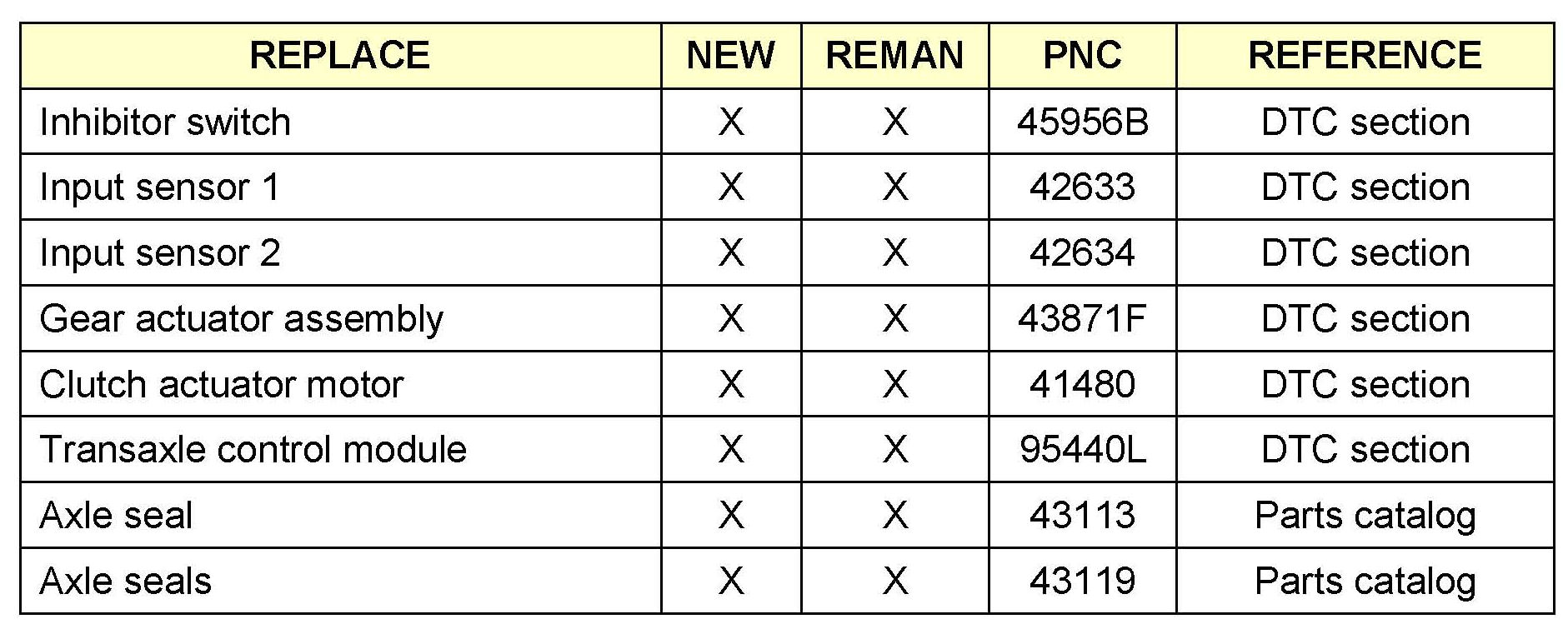 The automatic transaxle warranty repair policy authorizes in-dealership repairs of the following components for both OEM (new) and remanufactured automatic transaxles: