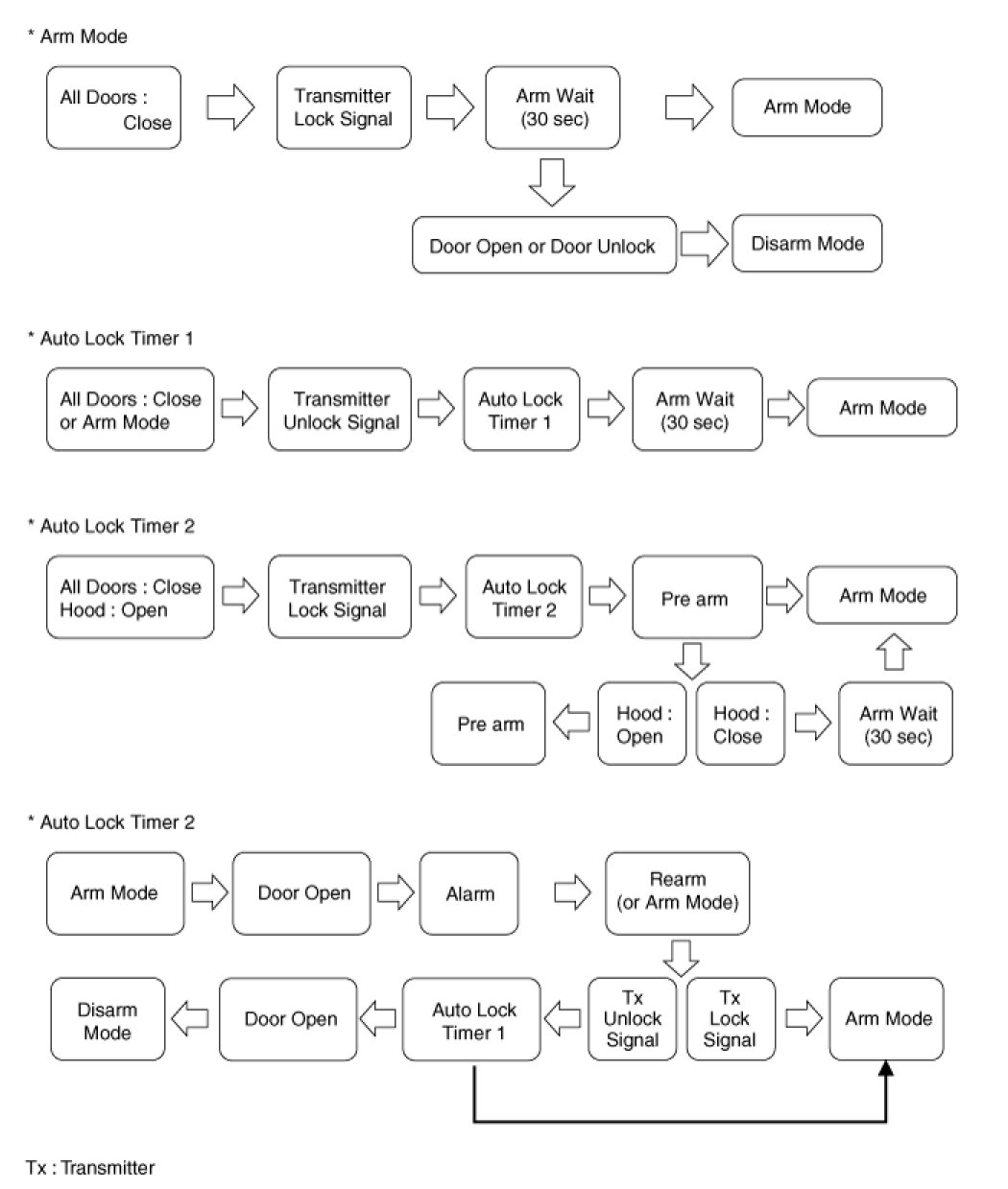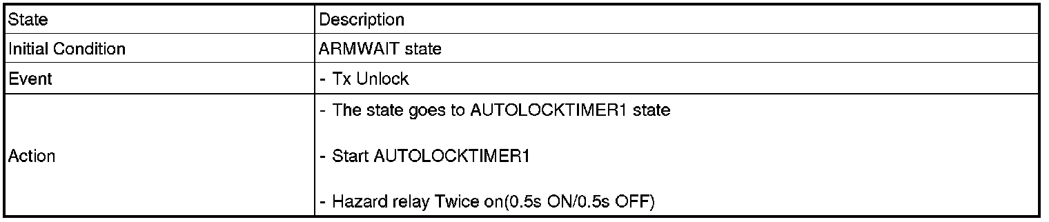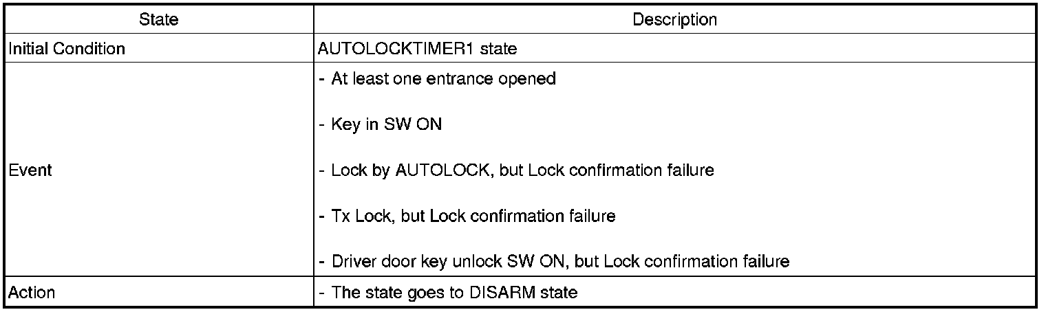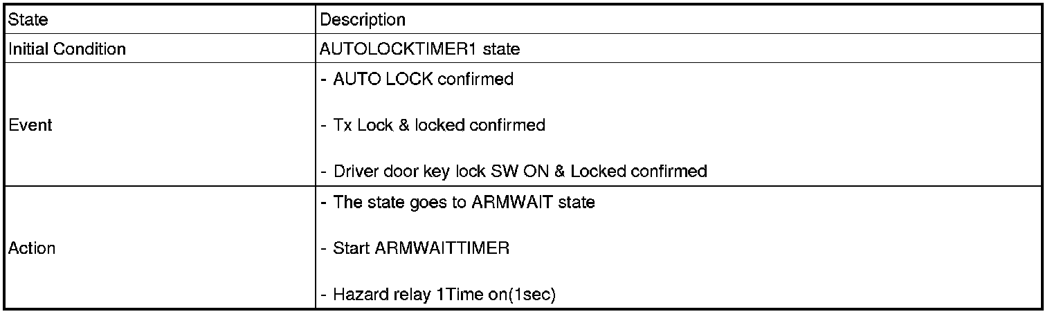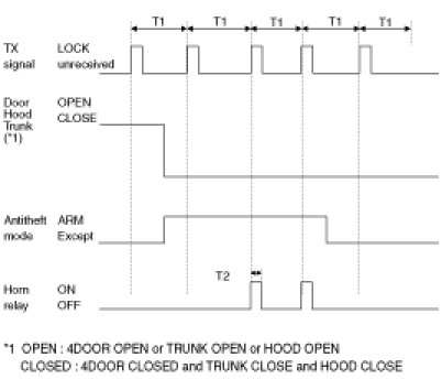 1. Under DOOR, TRUNK or HOOD: Closed, HORN(T2 output), HAZARD(1s-output) signals are output if TLOCK signal is received again within T1 from the moment when the mode transits to ARM mode by TLOCK operation and ARM mode is kept.