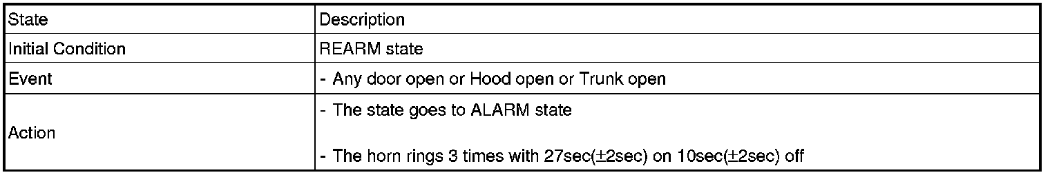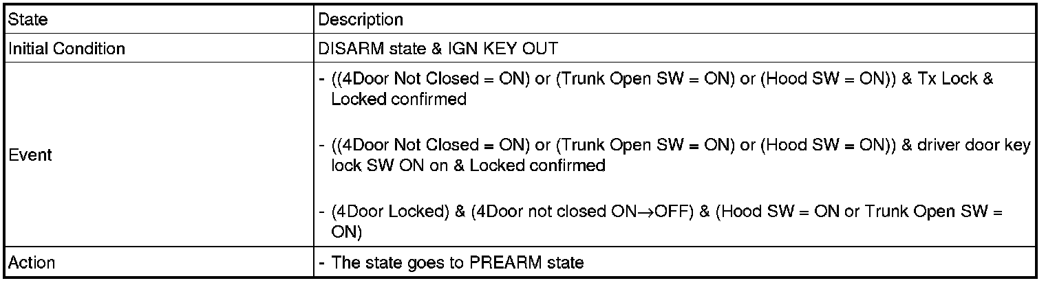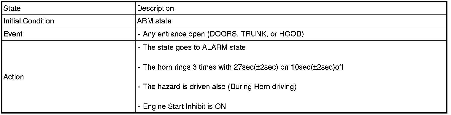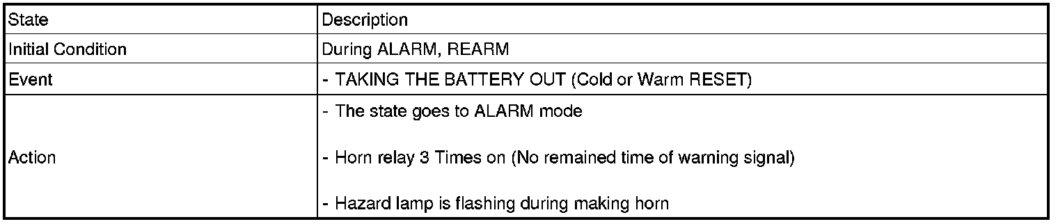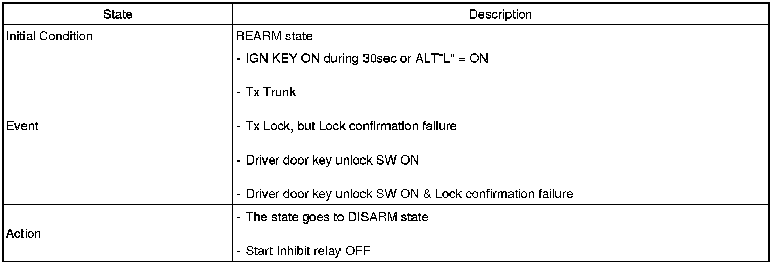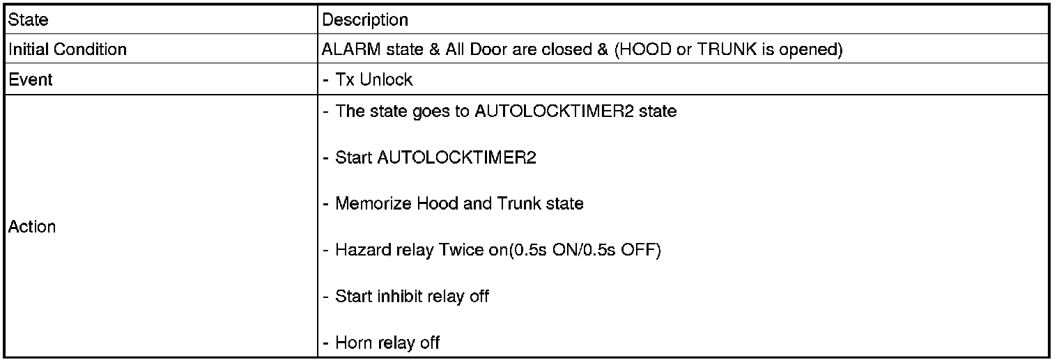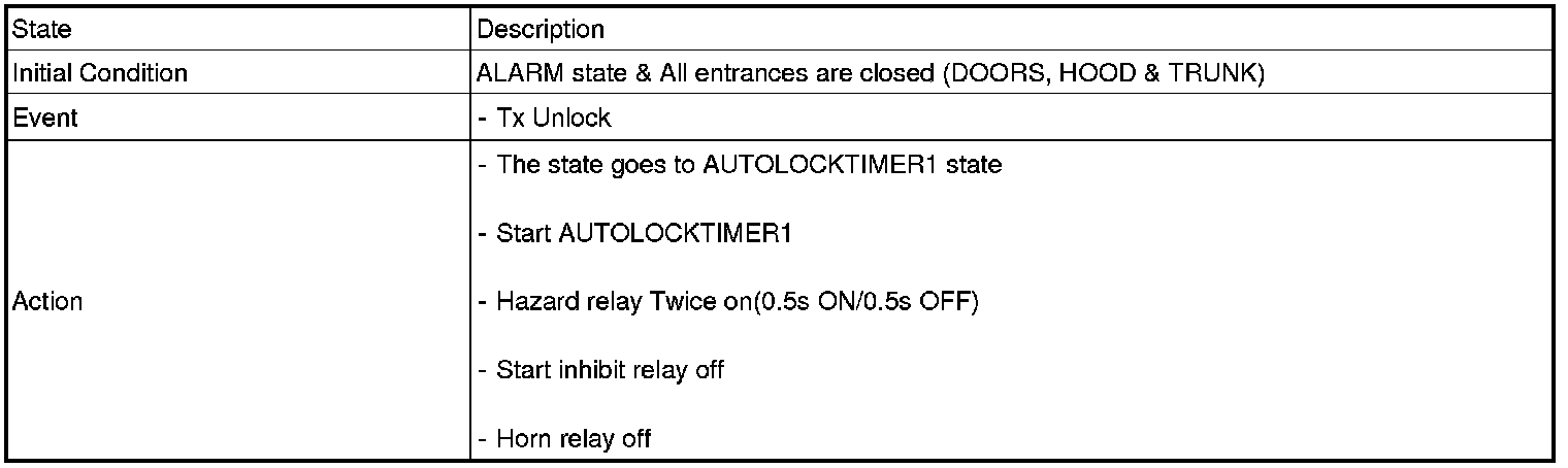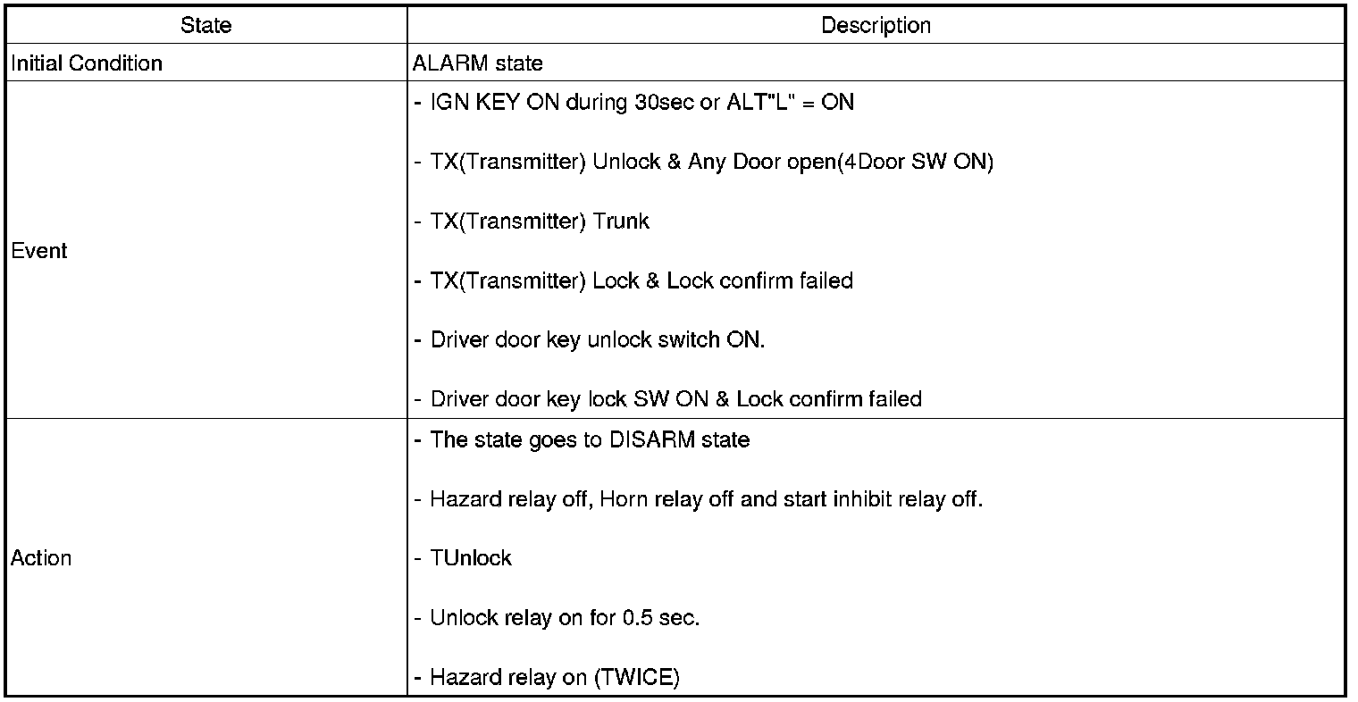 2. PANIC alarm is turned OFF if (TLOCK/UNLOCK/PANIC/TRUNK UNLOCK /KEY IN /DOOR KEY LOCK/DOOR KEY UNLOCK / TRUNK KEY UNLOCK ) signals are received during PANIC alarm.