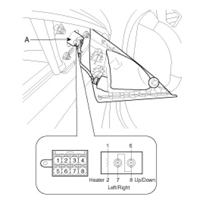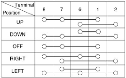 Apply battery voltage to each terminal as shown in the table and verify that the mirror operates properly.