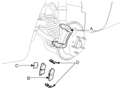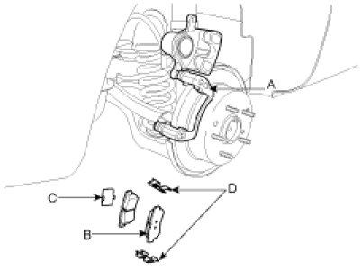 2. Remove the pads (B), the pad shims (C) and the pad springs (D) from the caliper carrier (A).