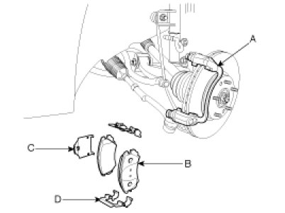 2. Remove the pads (B), the pad shims (C) and the pad springs (D) from the caliper carrier (A).