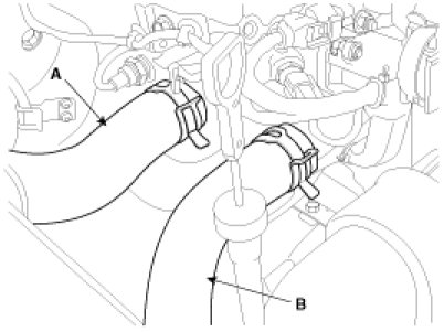 5. Remove the upper radiator hose (A) and lower radiator hose (B).